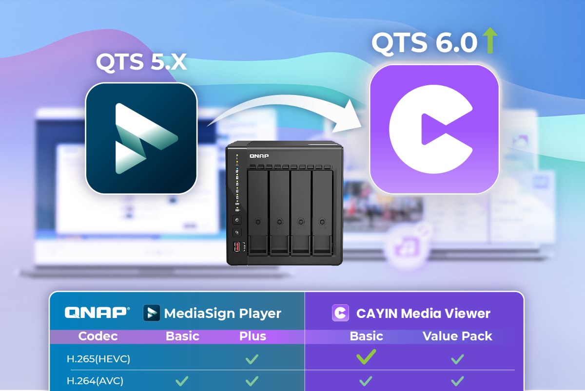 為了提供更穩定的多媒體體驗,鎧應科技宣布由 Media Viewer 正式接續 MediaSign Player 的服務。即將推出的 v1.7 CAYIN Media Viewer 將支援原有的 MediaSign Player Plus 授權。此項授權模式的調整確保用戶在轉向 QNAP QTS 6.0 系統環境時,能持續享受 H.265 (HEVC) 等高畫質影音管理功能。