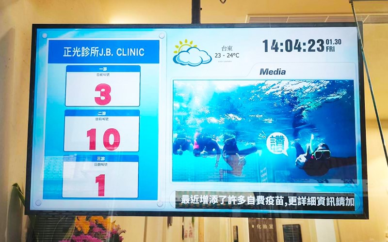 PilotTV Media は、コアとなる呼び出し管理システムの開発と統合を担当。CAYIN のプレーヤーと深く連携することで、1 対 1・多対 1 の表示構成に対応 —— 診療所が診察室の運用をどう変えても、呼び出し情報は常に正しい画面に、正しいタイミングで表示されます。