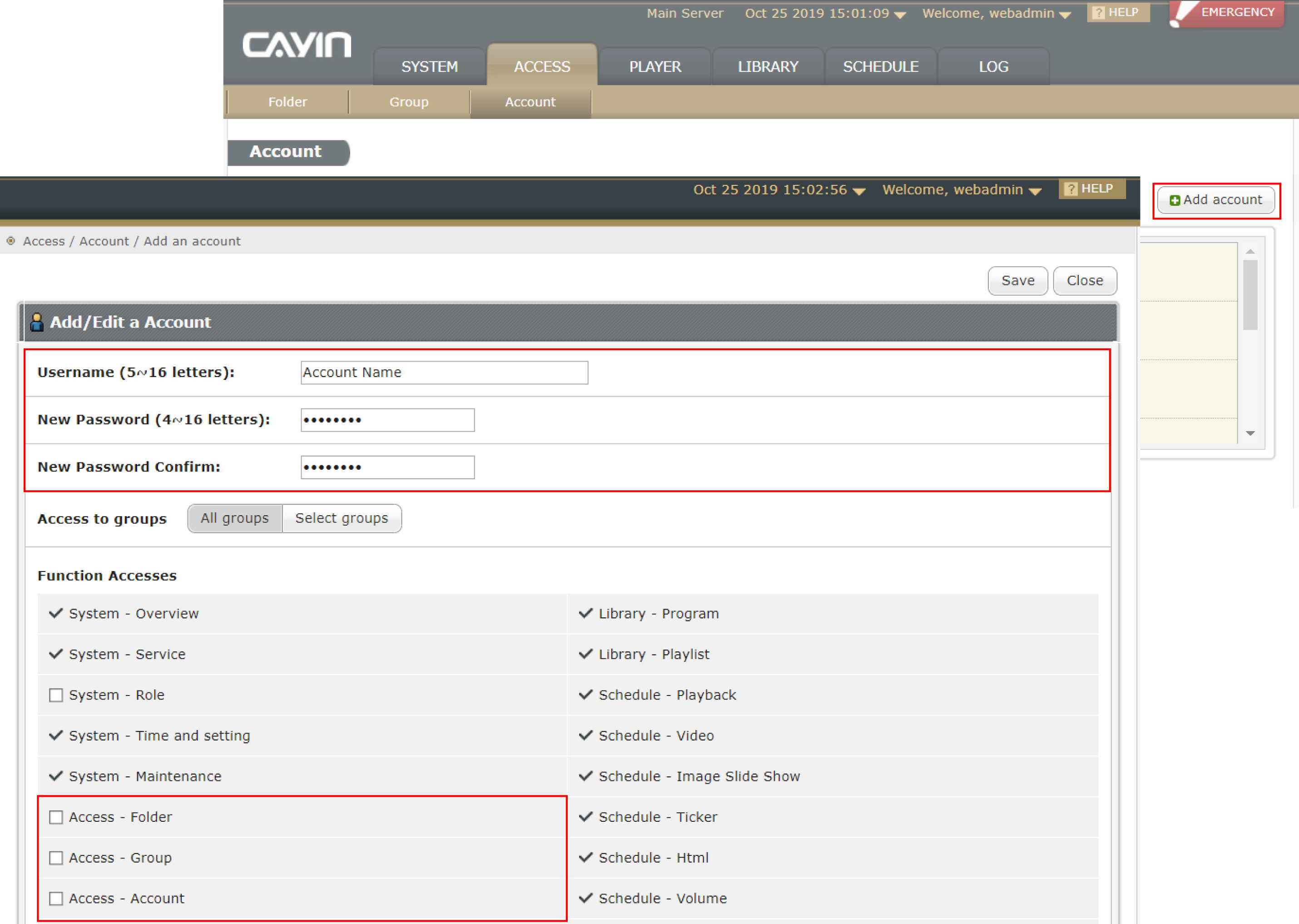 If you don’t want to use the account “administrator” to manage SMP, you can create an account to do different managerial jobs. Go to ACCESS > Account. Click Add account and you will see a pop-up window. Enter an account name and a password. Enter the password again to confirm it.
