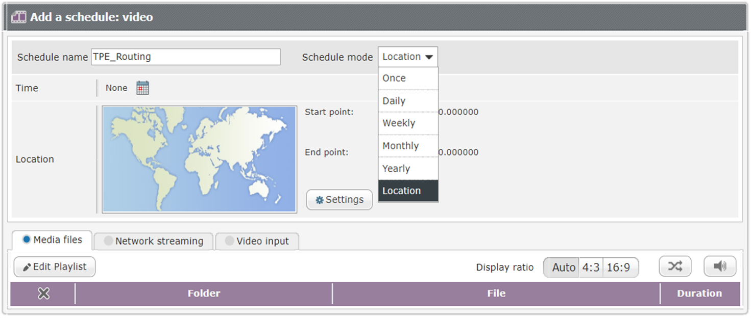 SMP players can play content based on locations. Now, we use an example to show you how you could play a full-screen video within a specific geographic area. Please follow the steps below to configure related settings.