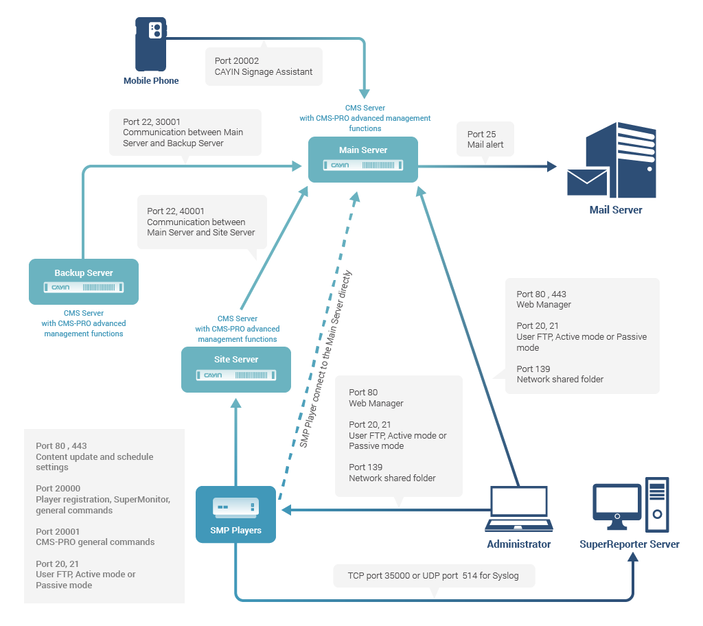 CAYIN CMS servers and SMP players are networked digital signage solutions, which provide efficient and convenient remote management, but, at the same time, increase the complexity of configuration based on your network environment.